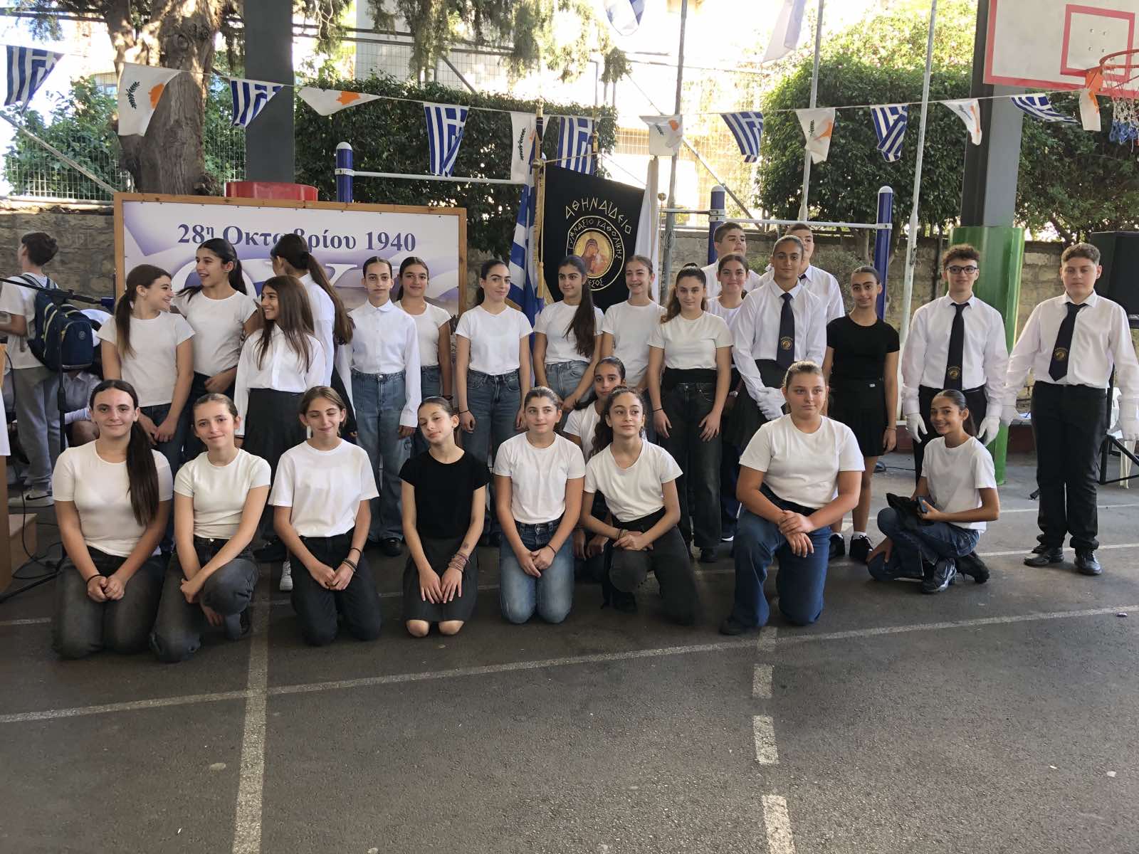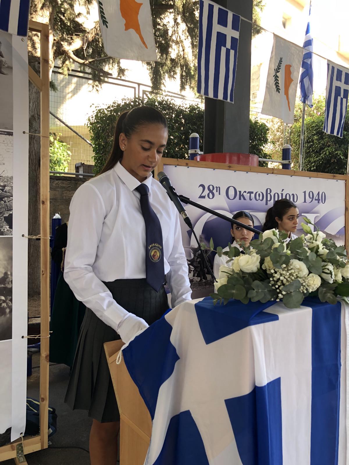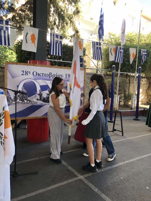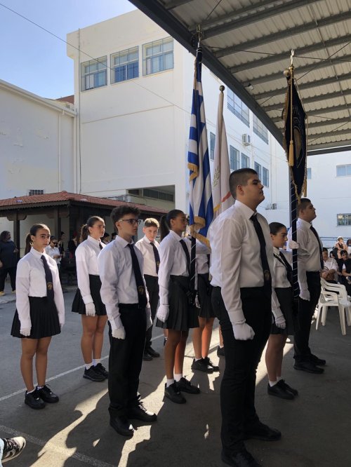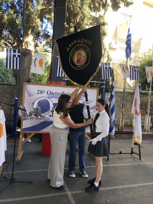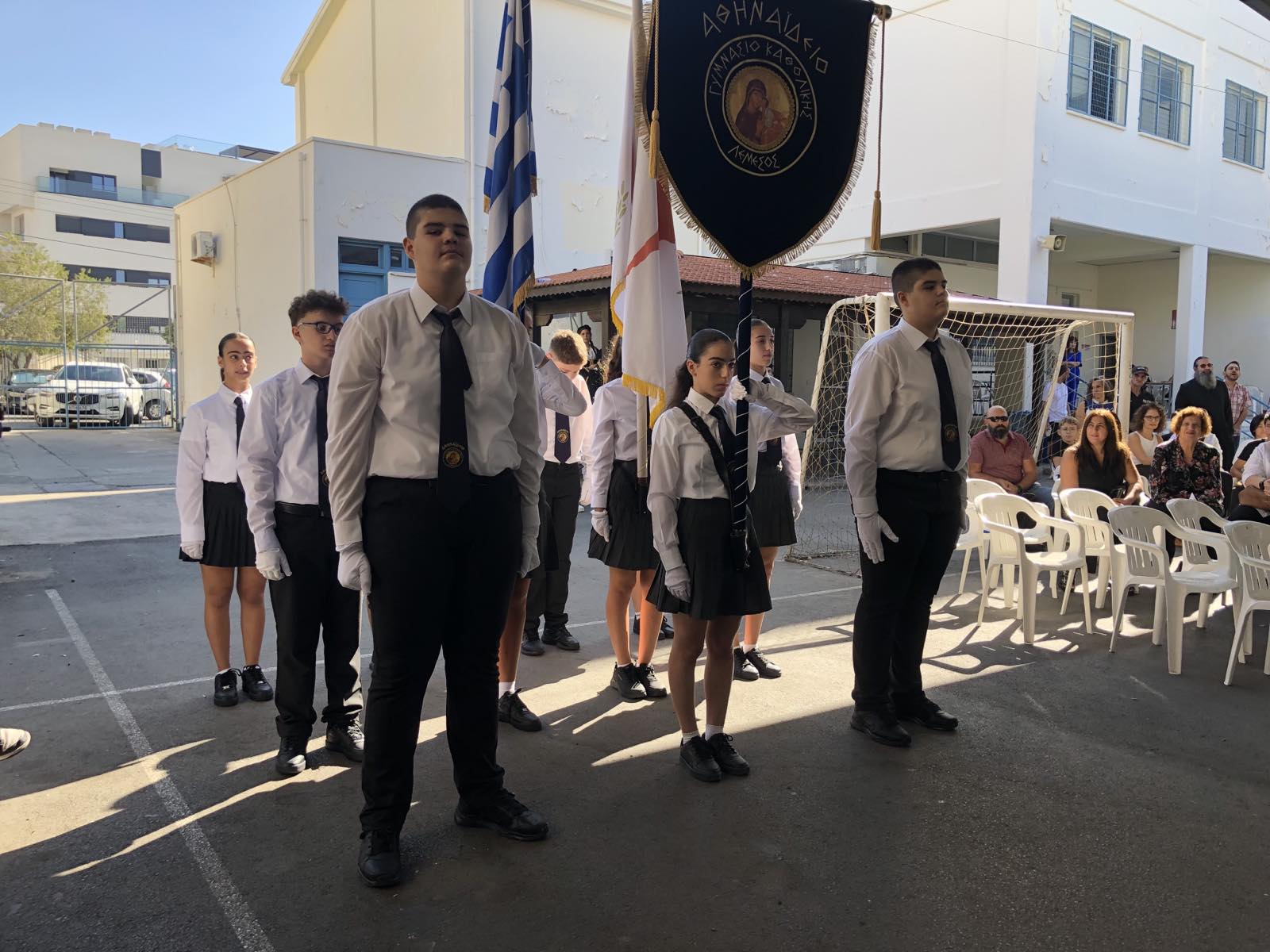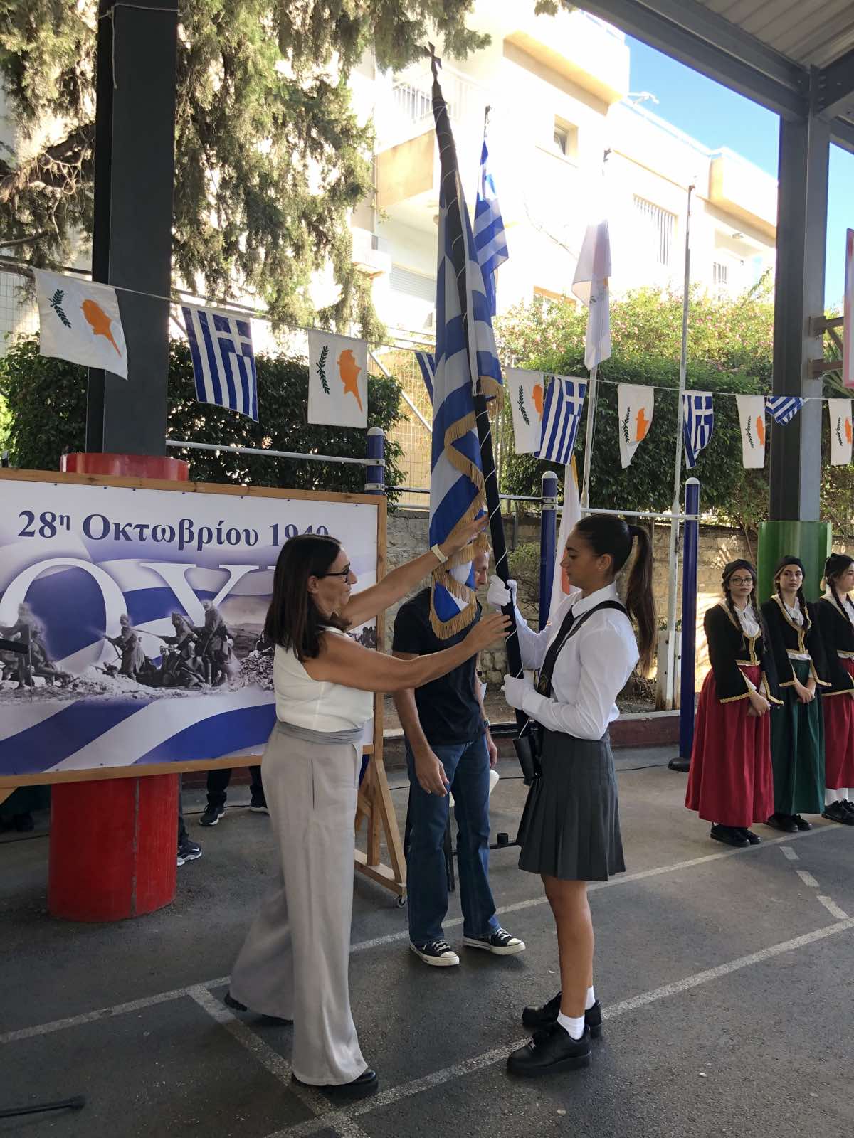Η εκδήλωση μνήμης και τιμής για τη Γιορτή της Σημαίας και της Εθνικής Επετείου της 28ης Οκτωβρίου 1940 πραγματοποιήθηκε τη Δευτέρα 27 Οκτωβρίου, στο άτριο του σχολείου Αθηνα'ί'δειου Γυμνασίου Καθολικής, με επίσημο και μεγαλοπρεπή τρόπο. Η εκδήλωση μας ξεκίνησε με την έπαρση των Σημαιών και τον Εθνικό Ύμνο, ακολούθησε η ανακήρυξη της Λαβαροφόρου, των Σημαιοφόρων και Παραστατών από τον Β.Δ.Α΄ κ. Χρήστο Μακρή. Η Διευθύντρια του Σχολείου μας κα Άννη Ερωτοκρίτου προσφώνησε τις άριστες μαθήτριες, παραδίδοντάς τους το Λάβαρο, την Ελληνική και την Κυπριακή Σημαία. Ακολούθησε η ορκωμοσία της Λαβαροφόρου, των Σημαιοφόρων και Παραστατών και η τιμητική περιφορά των ιερών μας συμβόλων.
