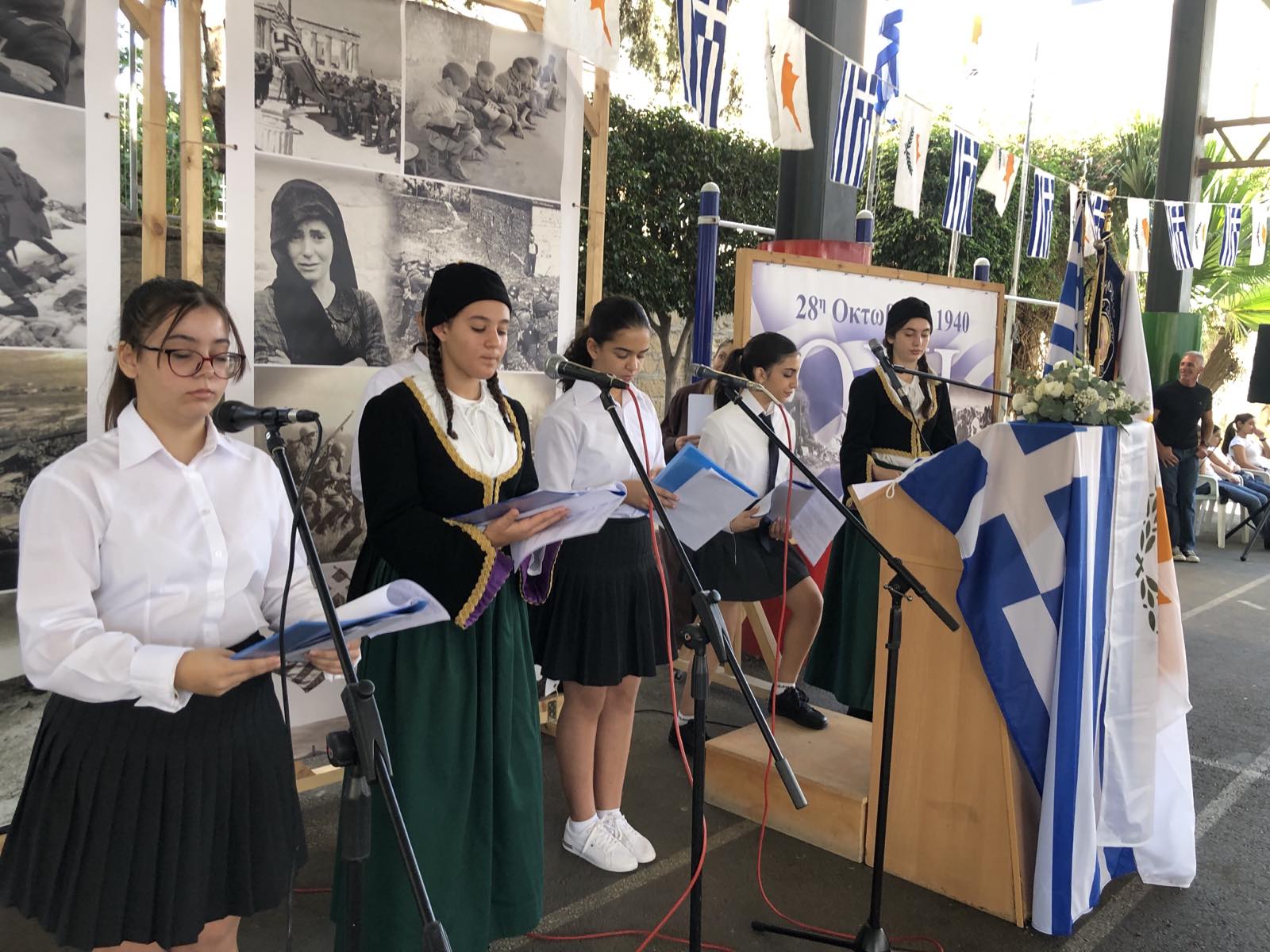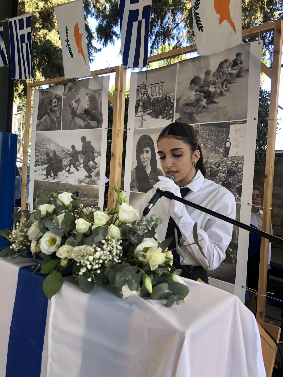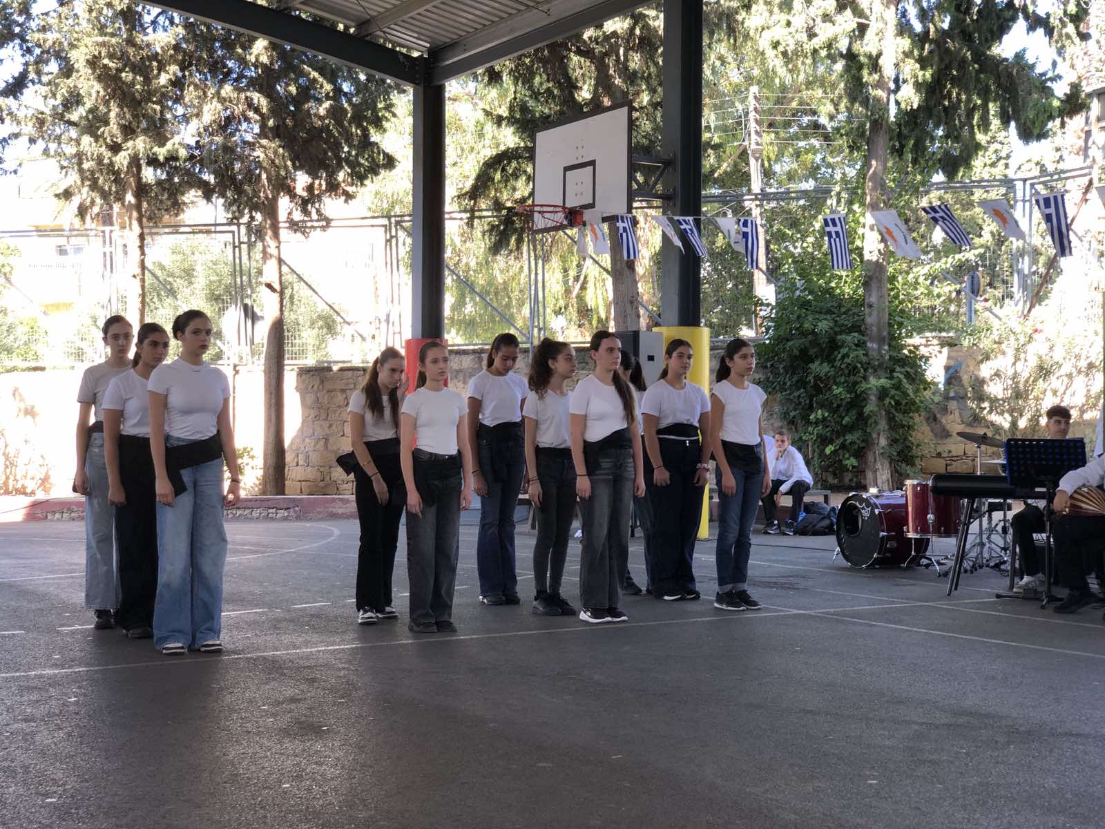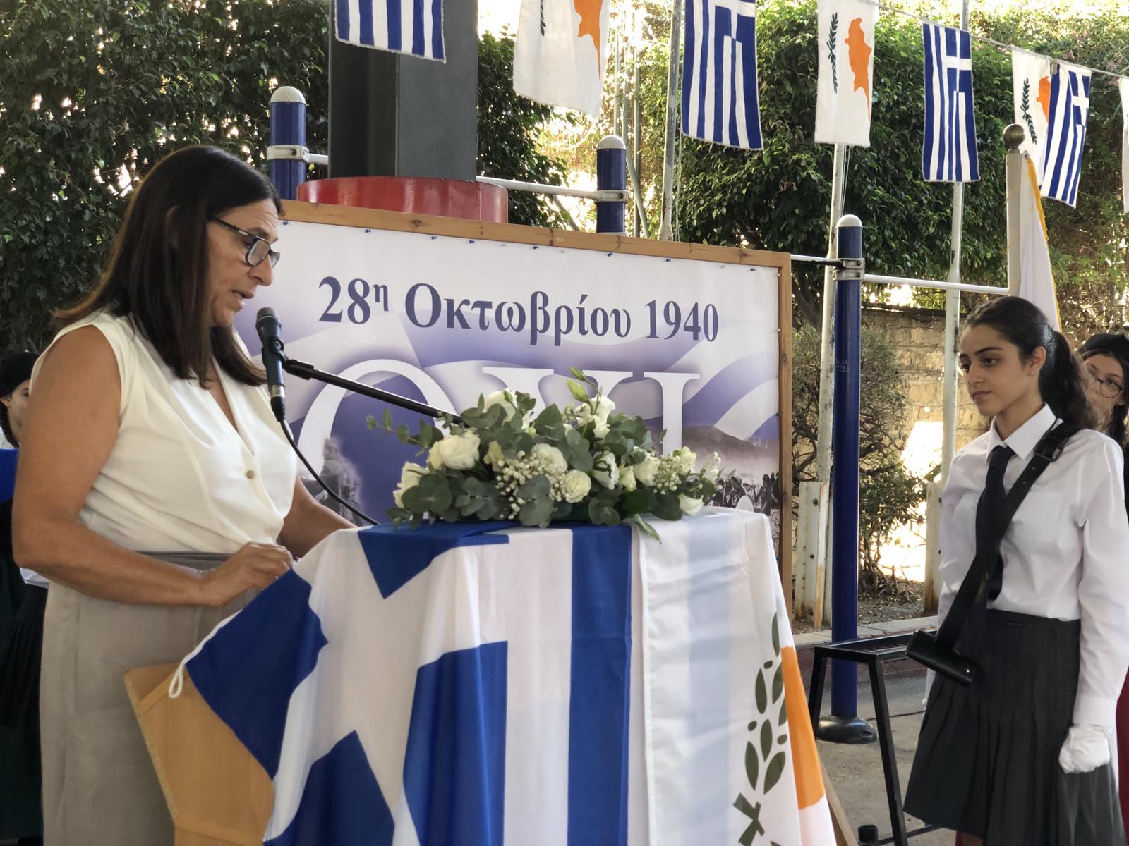 Η εκδήλωση μνήμης και τιμής για τη Γιορτή της Σημαίας και της Εθνικής Επετείου της 28ης Οκτωβρίου 1940 πραγματοποιήθηκε τη Δευτέρα 27 Οκτωβρίου, στο άτριο του σχολείου Αθηνα'ί'δειου Γυμνασίου Καθολικής, με επίσημο και μεγαλοπρεπή τρόπο. Η εκδήλωση μας ξεκίνησε με την έπαρση των Σημαιών και τον Εθνικό Ύμνο, ακολούθησε η ανακήρυξη της Λαβαροφόρου, των Σημαιοφόρων και Παραστατών από τον Β.Δ.Α΄ κ. Χρήστο Μακρή. Η Διευθύντρια του Σχολείου μας κα Άννη Ερωτοκρίτου προσφώνησε τις άριστες μαθήτριες, παραδίδοντάς τους το Λάβαρο, την Ελληνική και την Κυπριακή Σημαία. Ακολούθησε η ορκωμοσία της Λαβαροφόρου, των Σημαιοφόρων και Παραστατών και η τιμητική περιφορά των ιερών μας συμβόλων.
