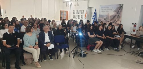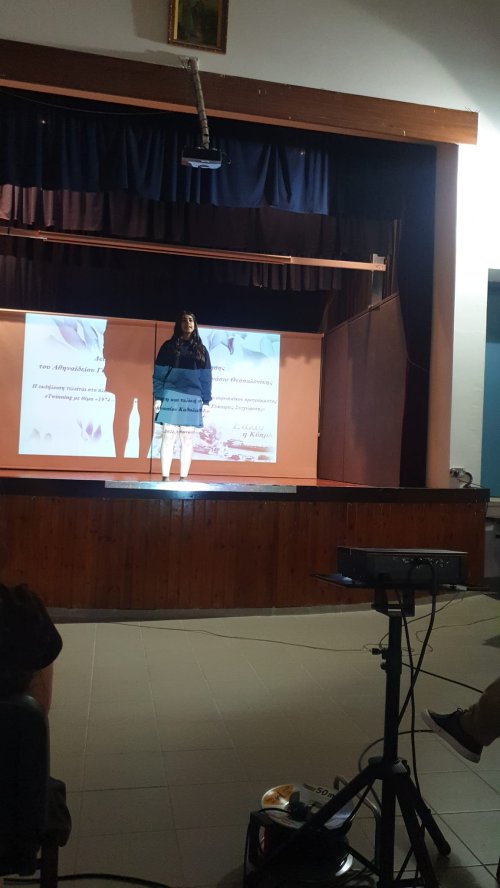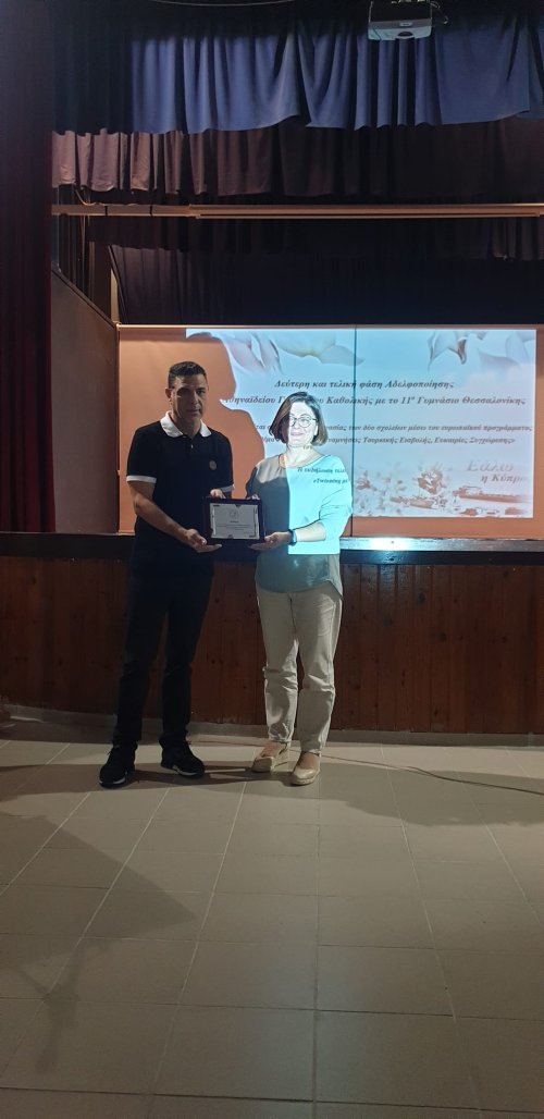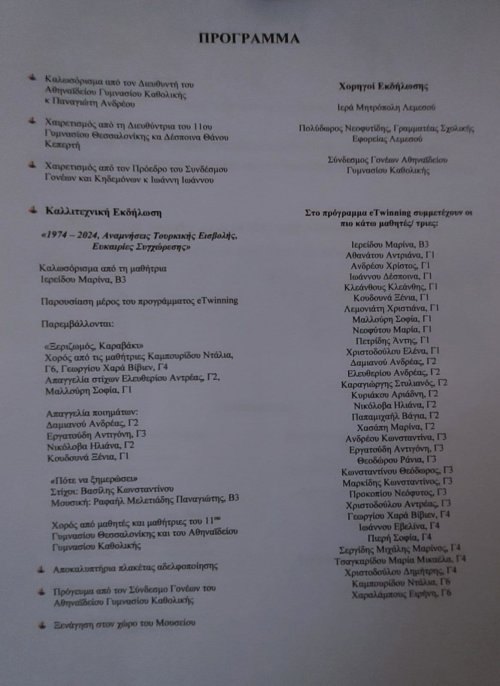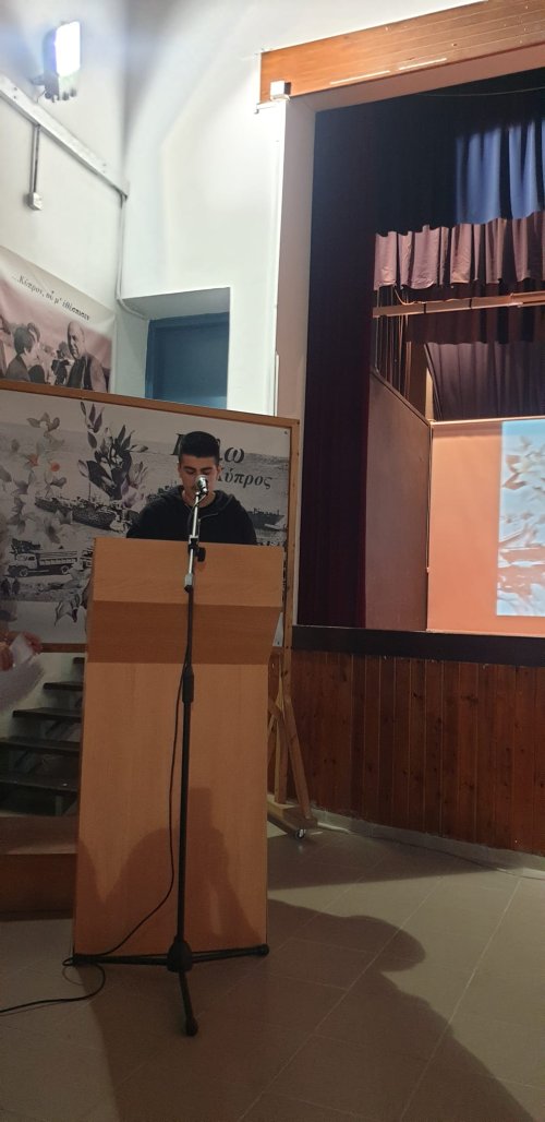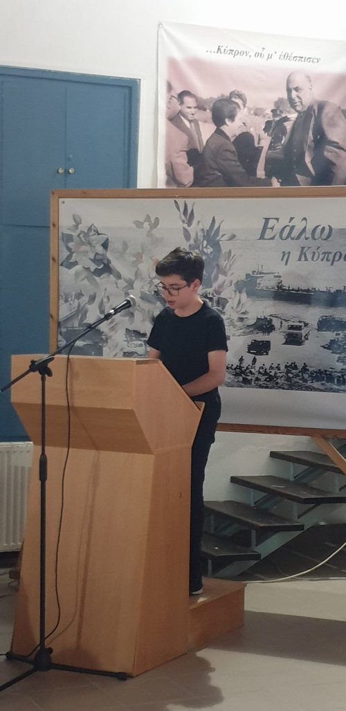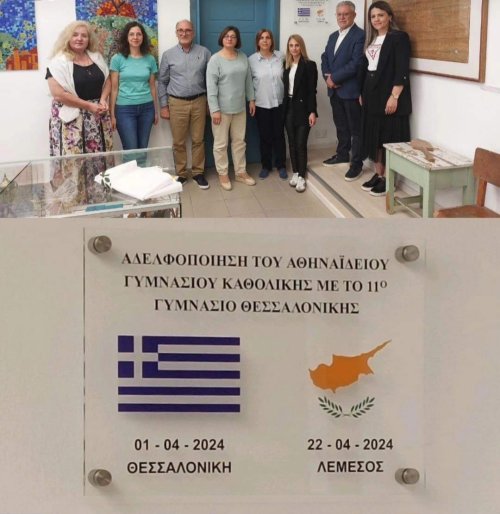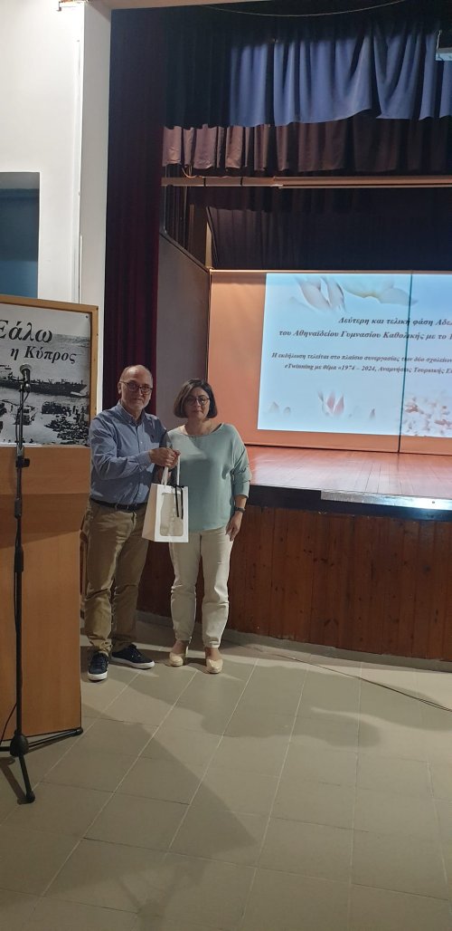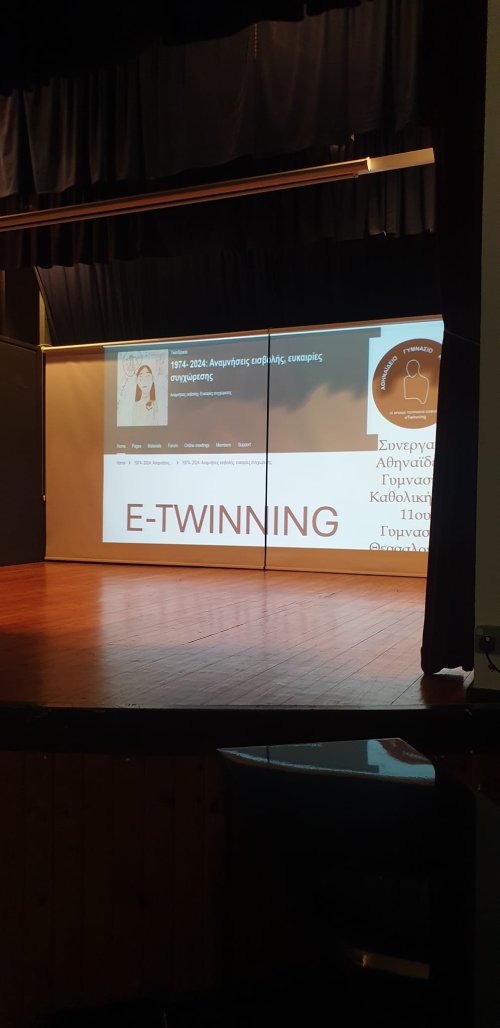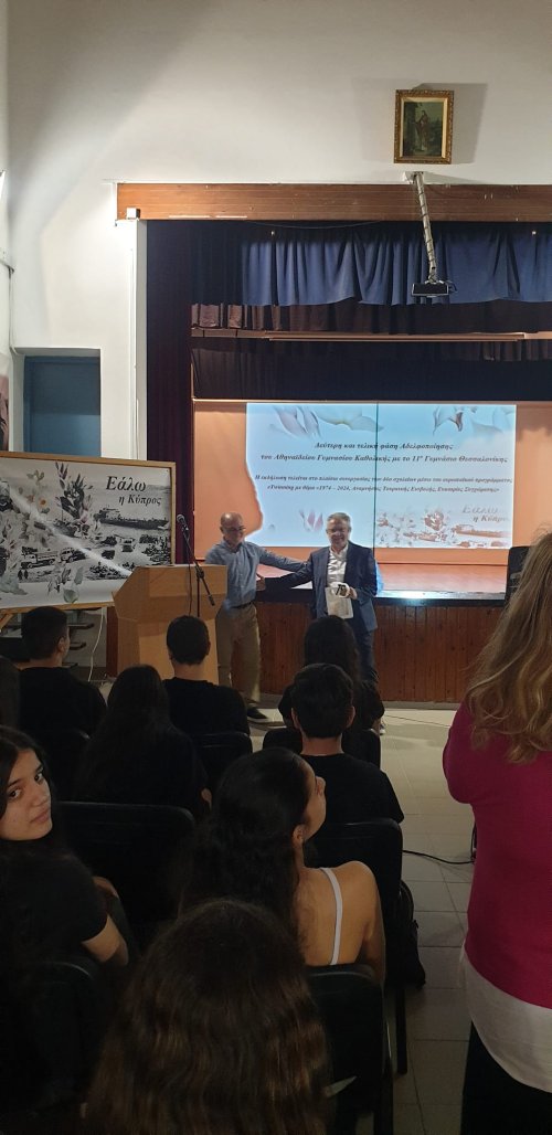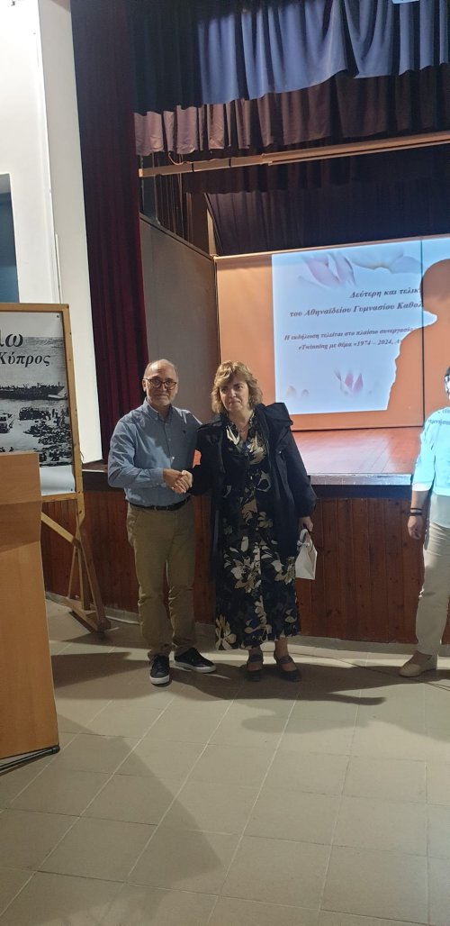 Πραγματοποιήθηκε σήμερα 22/02/24 στην αίθουσα Γεώργιου Σεφέρη η 2η και τελική φάση αδελφοποίησης των δυο σχολείων. Η σεμνή, αλλά συγκινητική τελετή, περιελάμβανε κυπριακό καλωσόρισμα, παρουσίαση του προγράμματος μας, χορό, απαγγελία ποιημάτων και τραγουδιού που γράφτηκαν μετά από έμπνευση των μαθητών μας μέσα από τις δράσεις του έργου "1974-2024 50 χρόνια Τουρκικής Εισβολής, Μνήμες, Αναμνήσεις, ευκαιρίες συγχώρεσης" στο πλαίσιο του Ευρωπαϊκού Προγράμματος eTwinning.