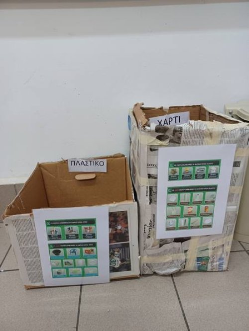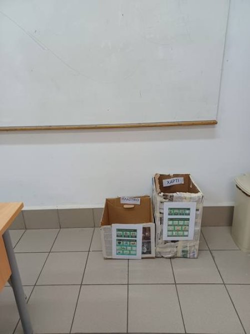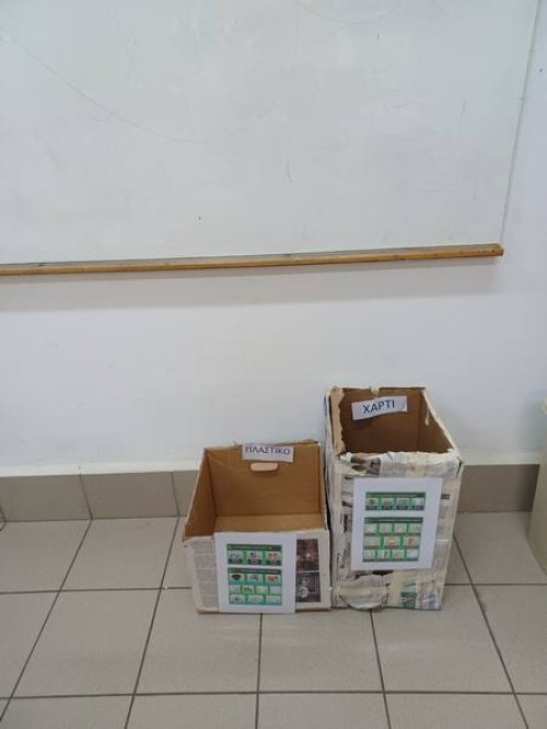 Στα πλαίσια της δράσης για μείωση των απορριμμάτων οι μαθητές που συμμετέχουν στο πρόγραμμα ανέλαβαν ρόλο ώστε να ενισχυθεί η ανακύκλωση υλικών (χαρτιού και πλαστικού) σε όλες τις τάξεις. Οι μαθητές έφεραν στο σχολείο χάρτινα κιβώτια, τα οποία αφού τα έντυσαν με εφημερίδες και τοποθέτησαν πινακίδα με τα υλικά κάθε κατηγορίας που μπορούν να ανακυκλωθούν, τα μετέφεραν σε όλες τις τάξεις του σχολείου.